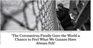 Nein, sie berichtet auf Haaretz nicht über die Spitäler oder über irgendwelche Massnahmen, sondern wie die Menschen dort mental diese Krise erleben. Und sie hat höchst Bedenkenswertes gehört: «The Coronavirus Finally Gave the World a Chance to Feel What We Gazans Have Always Felt», oder zu Deutsch: «Das Coronavirus hat der Welt die Chance gegeben, endlich nachzufühlen, wie wir uns hier in Gaza schon seit vielen Jahren fühlen.»